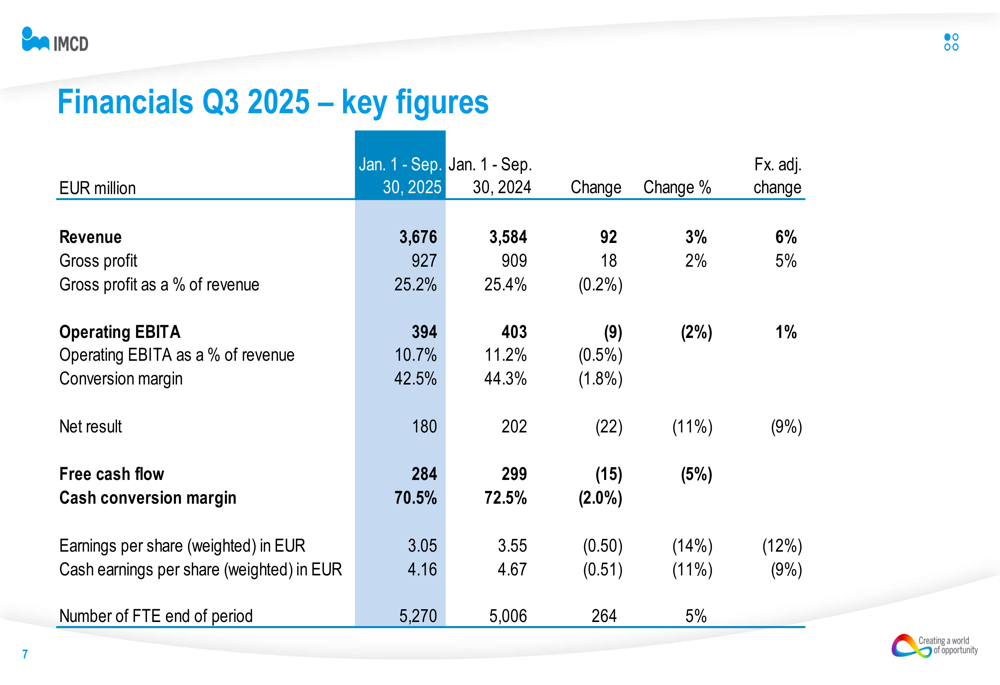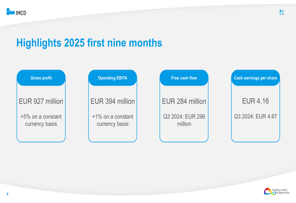 IMCD’s financial results for the first nine months of 2025 showed mixed performance. The company achieved gross profit of €927 million, representing a 5% increase on a constant currency basis compared to the same period in 2024. Operating EBITA grew more modestly at 1% on a constant currency basis, reaching €394 million.