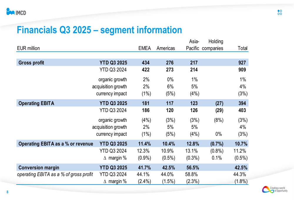 IMCD’s performance varied across its regional segments. The company provided a detailed breakdown of gross profit and operating EBITA by region, highlighting different growth patterns and challenges: