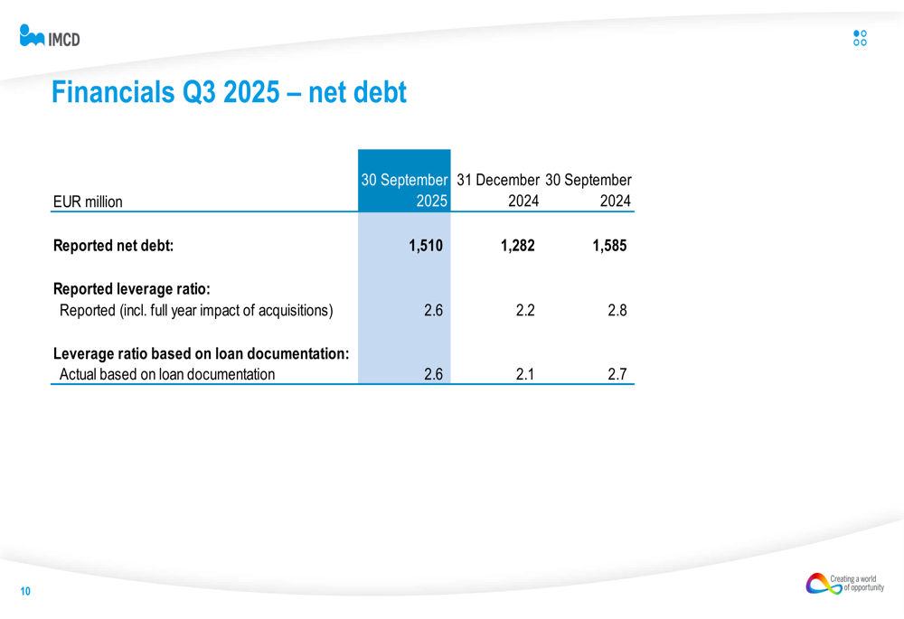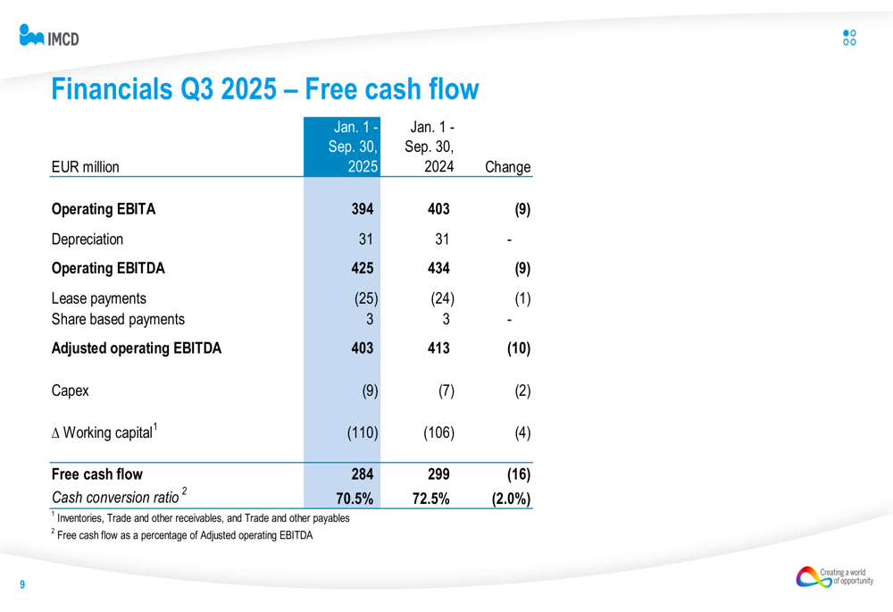 IMCD’s free cash flow for the first nine months of 2025 reached €284 million, slightly down from €299 million in the same period of 2024. The cash conversion ratio declined to 70.5% from 72.5% in the previous year, reflecting increased working capital requirements and capital expenditures.