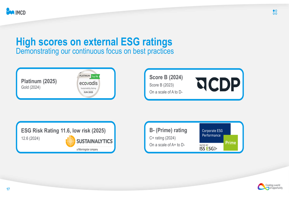The company highlighted its strong ESG performance, with high scores from external rating agencies including a Platinum rating from EcoVadis in 2025 and a low-risk rating from Sustainalytics. This focus on sustainability represents an increasingly important aspect of IMCD’s corporate strategy.