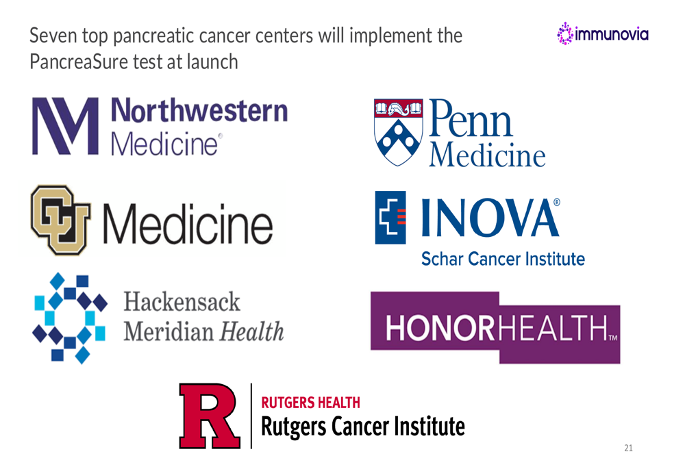 Immunovia highlighted that seven top pancreatic cancer centers will implement the PancreaSure test at launch, including Northwestern Medicine, Penn Medicine, Hackensack Meridian Health, HonorHealth, Rutgers Cancer Institute, CU Medicine, and Inova. This institutional adoption represents a significant endorsement of the technology.