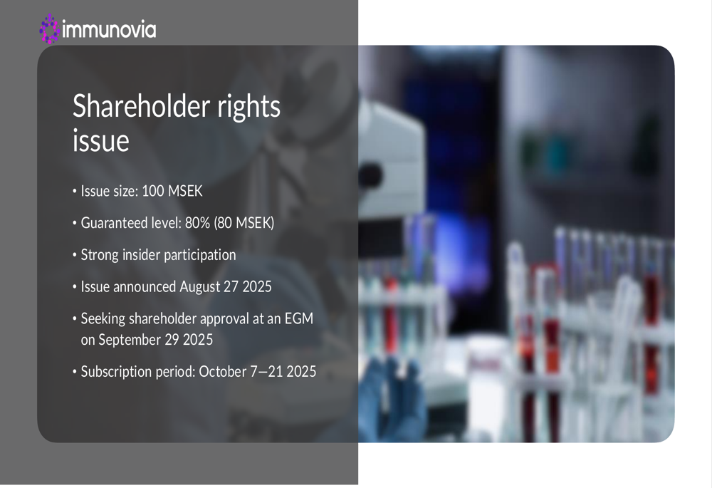 The company expects cash burn to increase to 8-10 MSEK monthly as funding shifts toward commercialization and clinical studies to support reimbursement. To address its funding needs, Immunovia announced a shareholder rights issue of 100 MSEK, with 80% (80 MSEK) already guaranteed. The subscription period is set for October 7-21, 2025, following shareholder approval at an extraordinary general meeting scheduled for September 29.