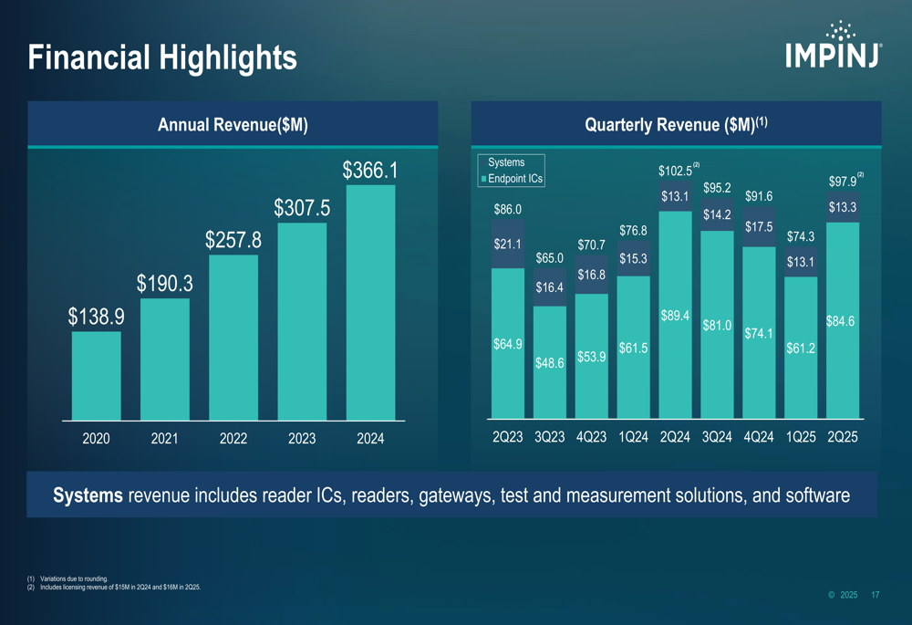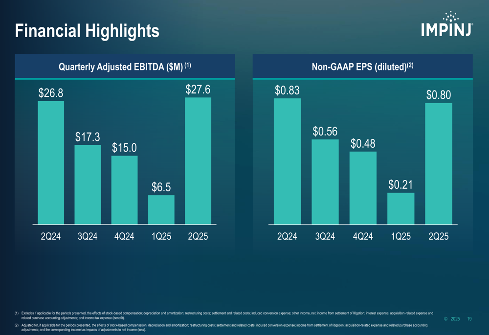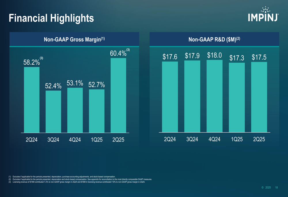 Impinj reported Q2 2025 revenue of $74.3 million, which included systems revenue of $102.5 million with $16 million in licensing revenue. The company achieved a record non-GAAP gross margin of 60.4%, significantly higher than previous quarters, and delivered adjusted EBITDA of $27.6 million, representing a strong 28.2% margin.