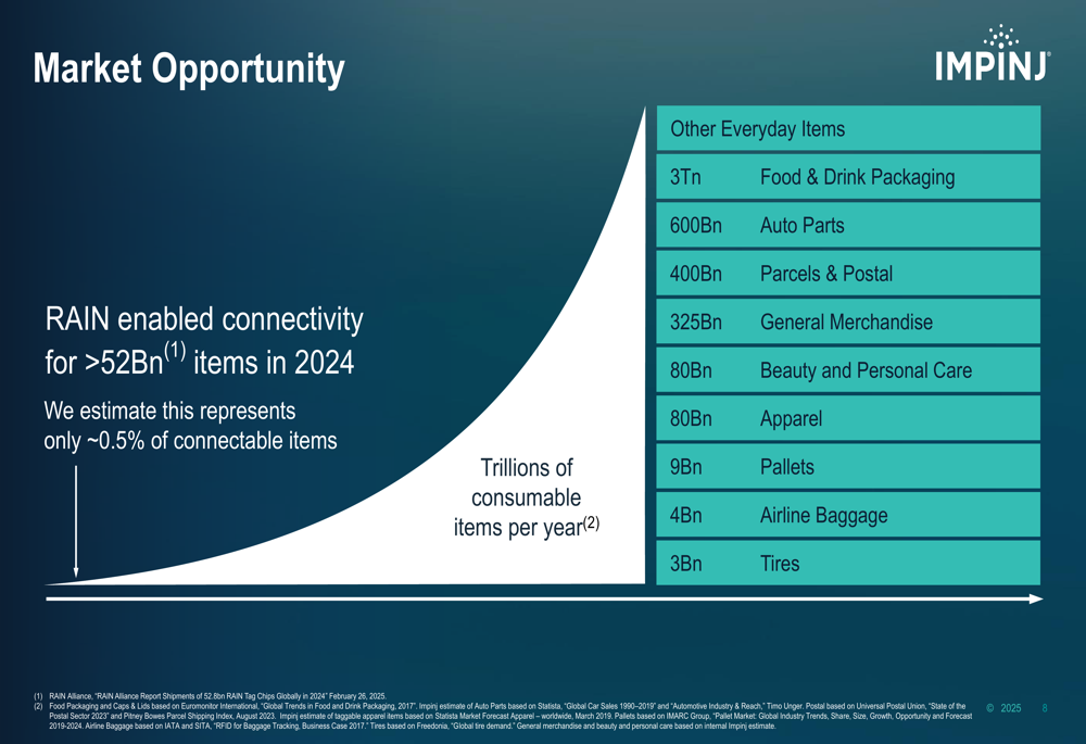 Impinj’s presentation emphasized the vast market opportunity ahead, with RAIN RFID currently enabling connectivity for over 52 billion items in 2024, representing only approximately 0.5% of connectable items worldwide. The company identified several major market segments with significant growth potential.