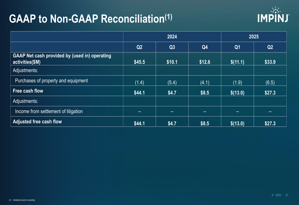 Impinj maintained a strong balance sheet with $260.5 million in cash and investments as of June 30, 2025, against $287.5 million in convertible debt. The company generated $27.5 million in trailing twelve-month adjusted free cash flow, demonstrating its ability to convert profitability into cash generation.