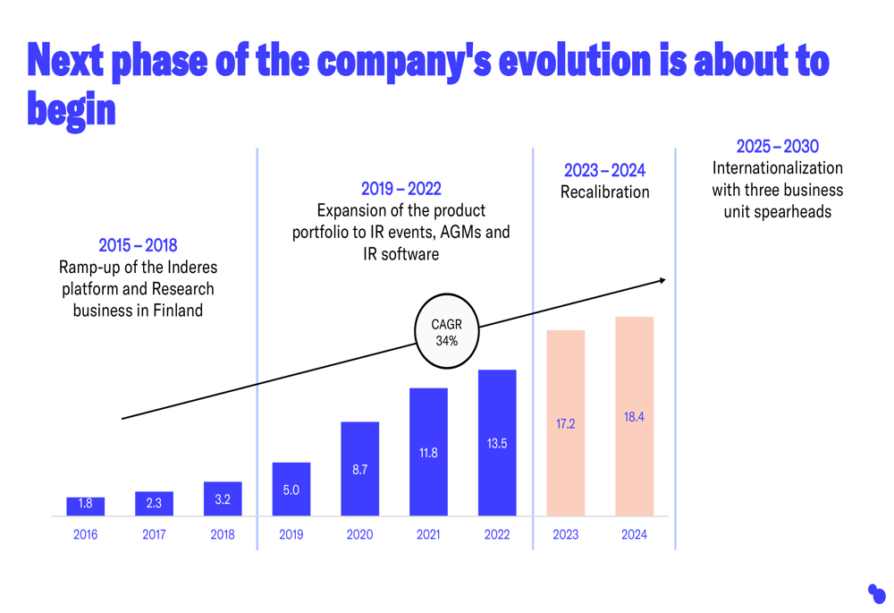 The software business shows promising growth, with determined progress toward market leadership in Finland. Inderes has signed new international channel partners for both its IR software and Videosync platform, with significant investments being made in product development and sales.