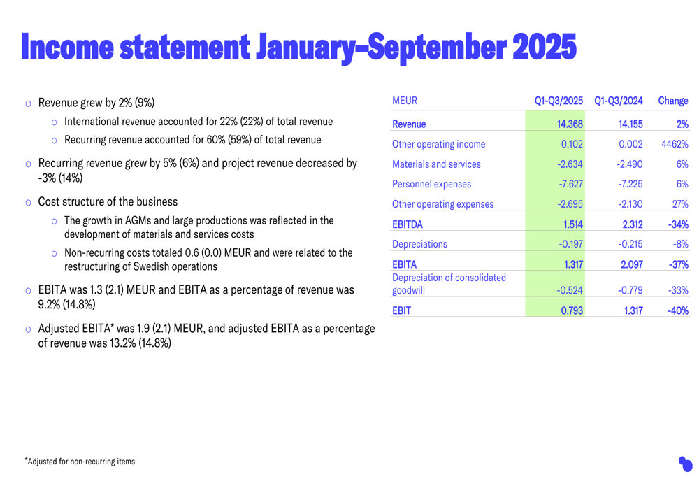 Inderes has maintained a strong focus on recurring revenue, which reached 60.4% of total revenue for the January-September period, up from 58.5% last year. This strategic emphasis on stable revenue streams has helped buffer against volatility in project-based income.