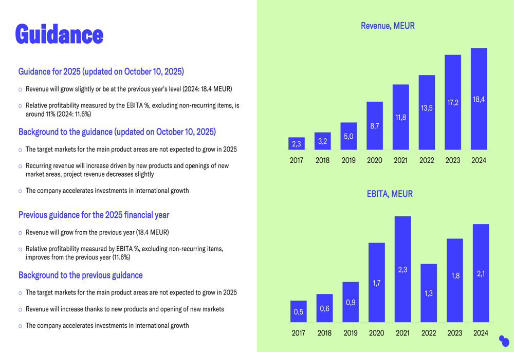 Inderes has updated its full-year 2025 guidance, expecting revenue to grow slightly or remain at the previous year’s level of €18.4 million. The company projects relative profitability measured by adjusted EBITA percentage to be around 11%, compared to 11.6% in 2024.