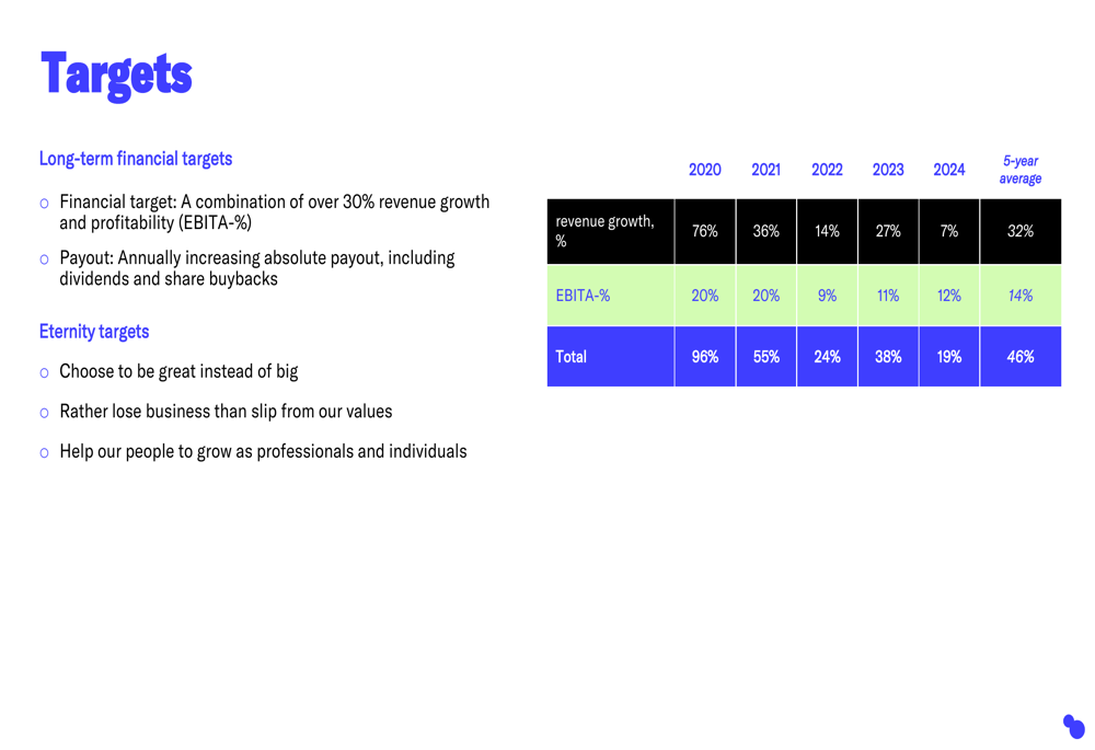 Long-term, Inderes maintains ambitious targets, aiming for a combined revenue growth and profitability (EBITA-%) of over 30%. The company has historically exceeded this target with a five-year average of 46%, though recent performance has been more modest.