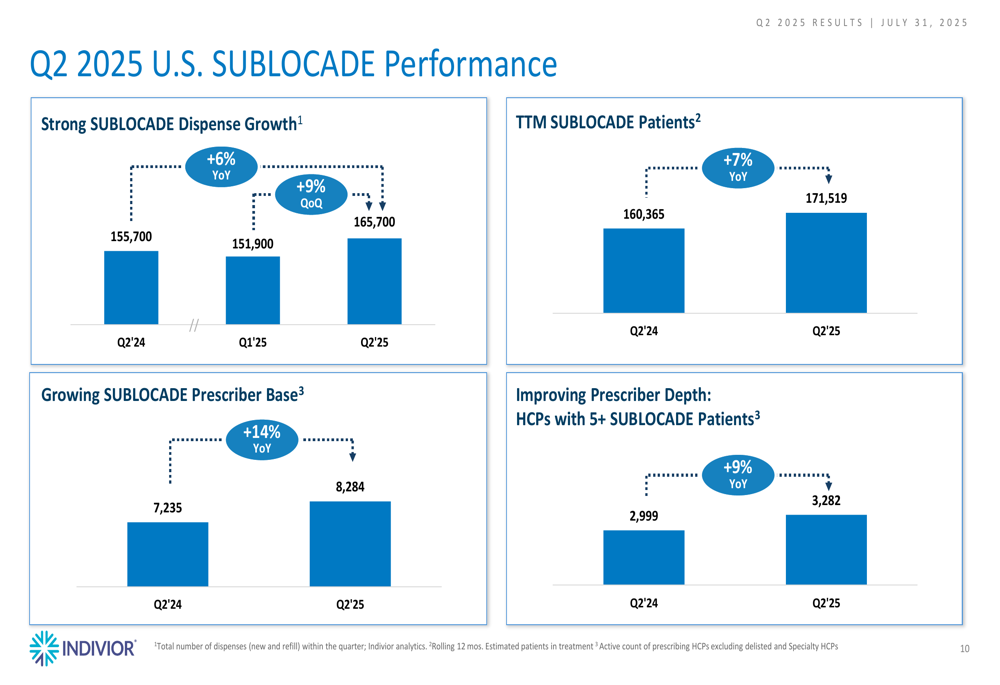SUBLOCADE’s performance metrics showed solid progress across key indicators. The company reported 165,700 SUBLOCADE dispenses in Q2 2025, a 6% year-over-year increase and a 9% sequential increase from Q1 2025. The trailing twelve-month patient count reached 171,519, up 7% from the previous year, while the prescriber base expanded by 14% to 8,284 healthcare providers.
