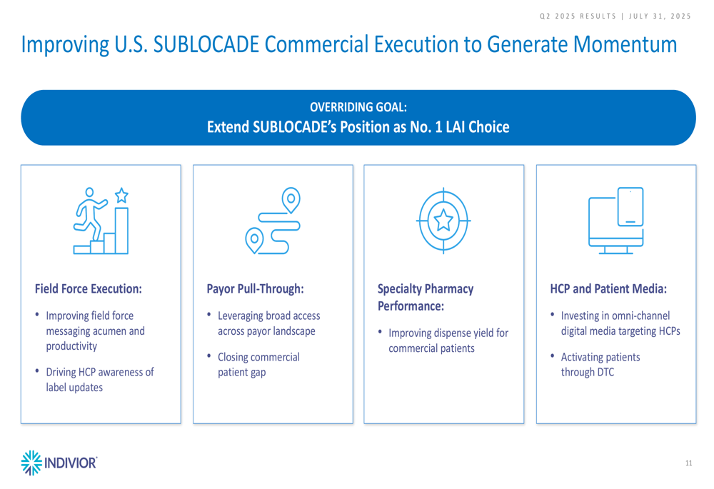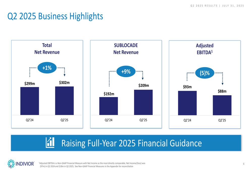 Indivior’s Q2 2025 results demonstrate the company’s ability to drive modest growth through its SUBLOCADE product line while investing in future expansion. The raised guidance reflects management’s confidence in continued momentum through the remainder of 2025, particularly for SUBLOCADE.