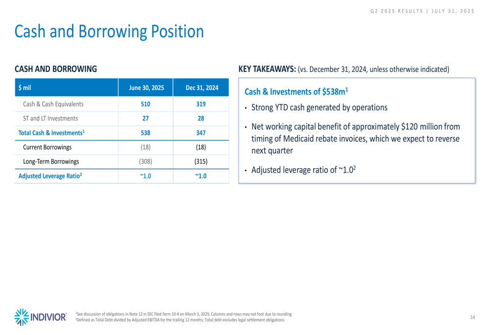 Indivior’s cash position strengthened significantly during the first half of 2025. As of June 30, 2025, the company reported $538 million in total cash and investments, up from $347 million at the end of 2024. This improvement was attributed to strong cash generated from operations, including a temporary working capital benefit of approximately $120 million from the timing of Medicaid rebate invoices.