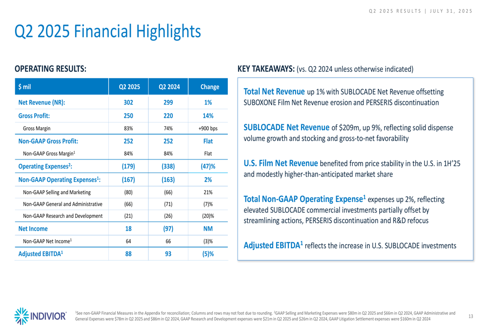 Indivior reported total net revenue of $302 million for Q2 2025, a modest 1% increase compared to $299 million in the same quarter last year. SUBLOCADE, the company’s injectable buprenorphine treatment for opioid use disorder, continued to be the primary growth driver with net revenue of $209 million, representing a 9% year-over-year increase.