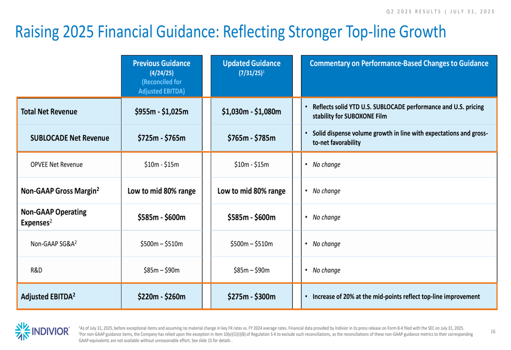 Based on the strong performance in the first half of 2025, Indivior raised its full-year financial guidance. The company now expects total net revenue between $1.03 billion and $1.08 billion, up from the previous range of $955 million to $1.025 billion. SUBLOCADE net revenue guidance was increased to $765-$785 million from $725-$765 million, while Adjusted EBITDA guidance was raised to $275-$300 million from $220-$260 million, representing a 20% increase at the midpoint.