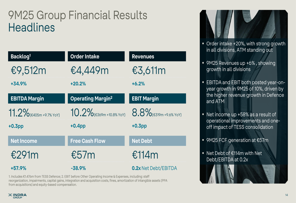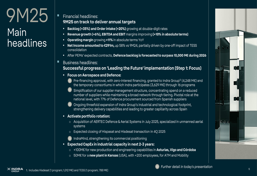 Indra reported substantial growth across all key financial metrics for the first nine months of 2025, with particularly strong performance in backlog and net income.