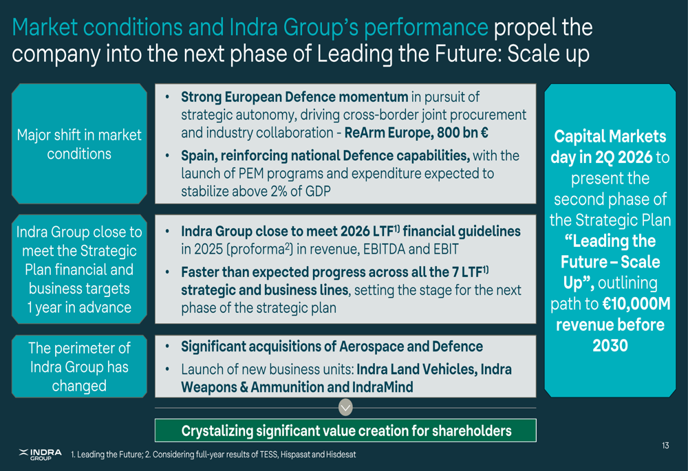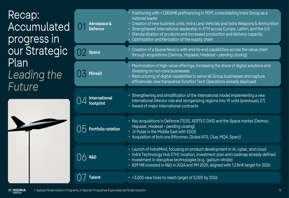 Indra’s presentation highlighted significant progress on its "Leading the Future" strategic plan, with advancements across seven key areas: