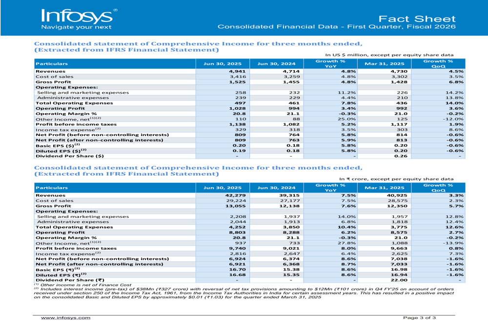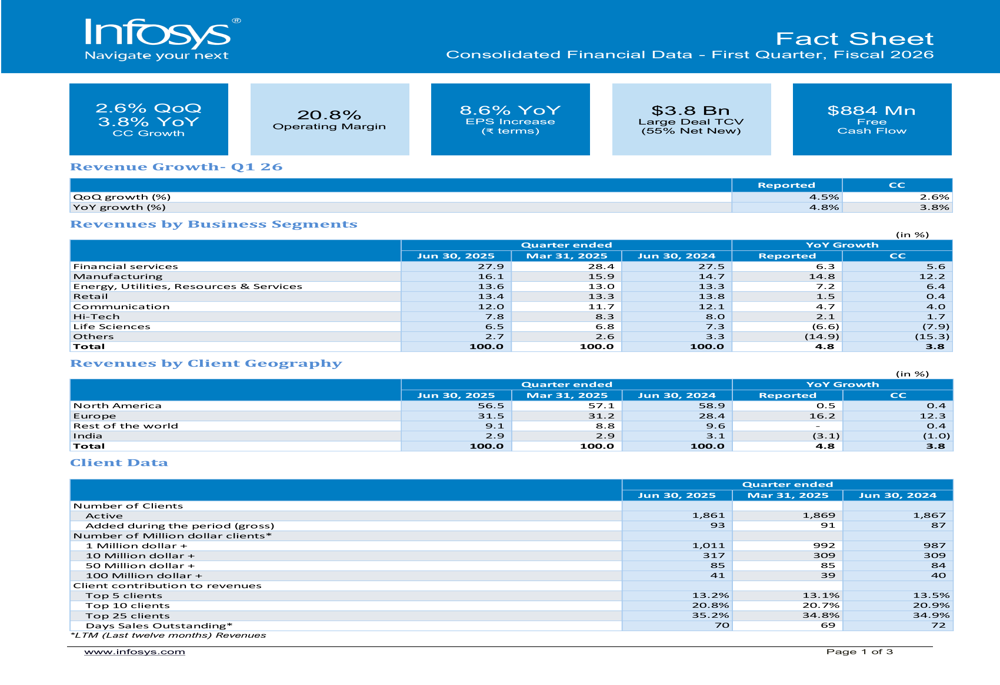 While the Q1 FY26 presentation focuses on historical performance, Infosys’ subsequent Q2 FY26 results provide important context for the company’s trajectory. In Q2, Infosys achieved revenue of $5.08 billion, indicating continued sequential growth from the Q1 figures presented here. The company also improved its operating margin to 21% in Q2, up from the 20.8% reported in Q1.