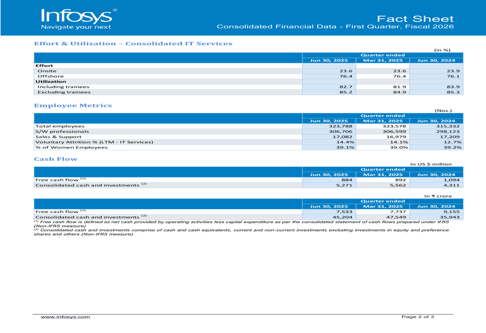 Infosys reported a total workforce of 323,788 employees as of June 30, 2025, representing a slight increase from 323,578 at the end of the previous quarter and up from 315,332 year-over-year. The company maintained a healthy offshore-onsite mix with 76.4% offshore and 23.6% onsite effort distribution.