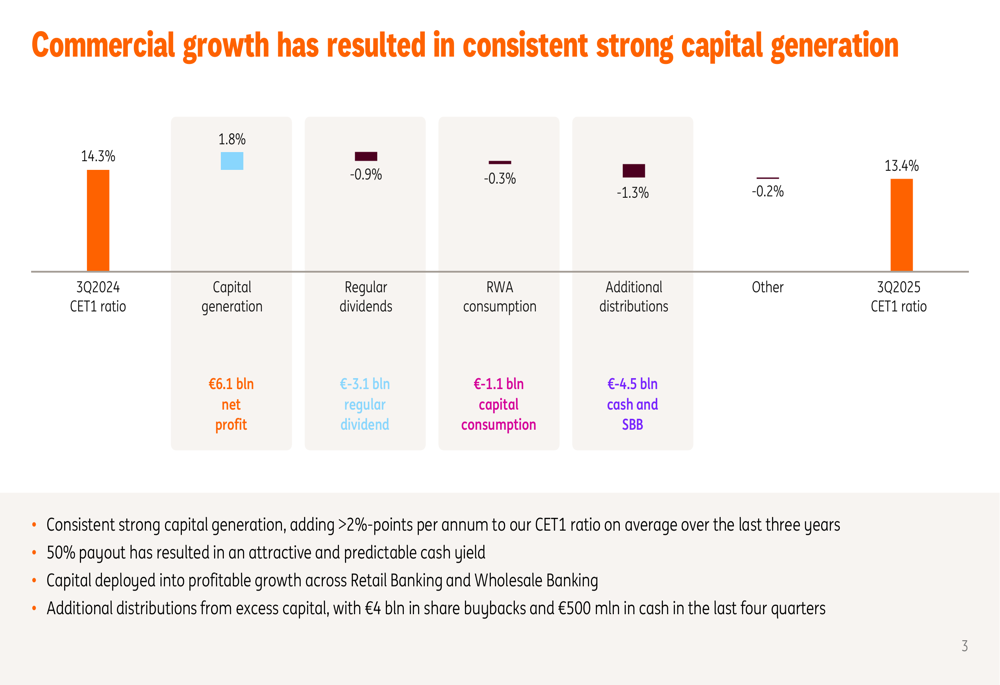 ING continues to generate strong capital, adding more than 2 percentage points annually to its CET1 ratio on average over the past three years. The bank’s capital waterfall chart shows the movement from a 14.3% CET1 ratio in Q3 2024 to 13.4% in Q3 2025, reflecting €6.1 billion in capital generation offset by distributions and growth investments.