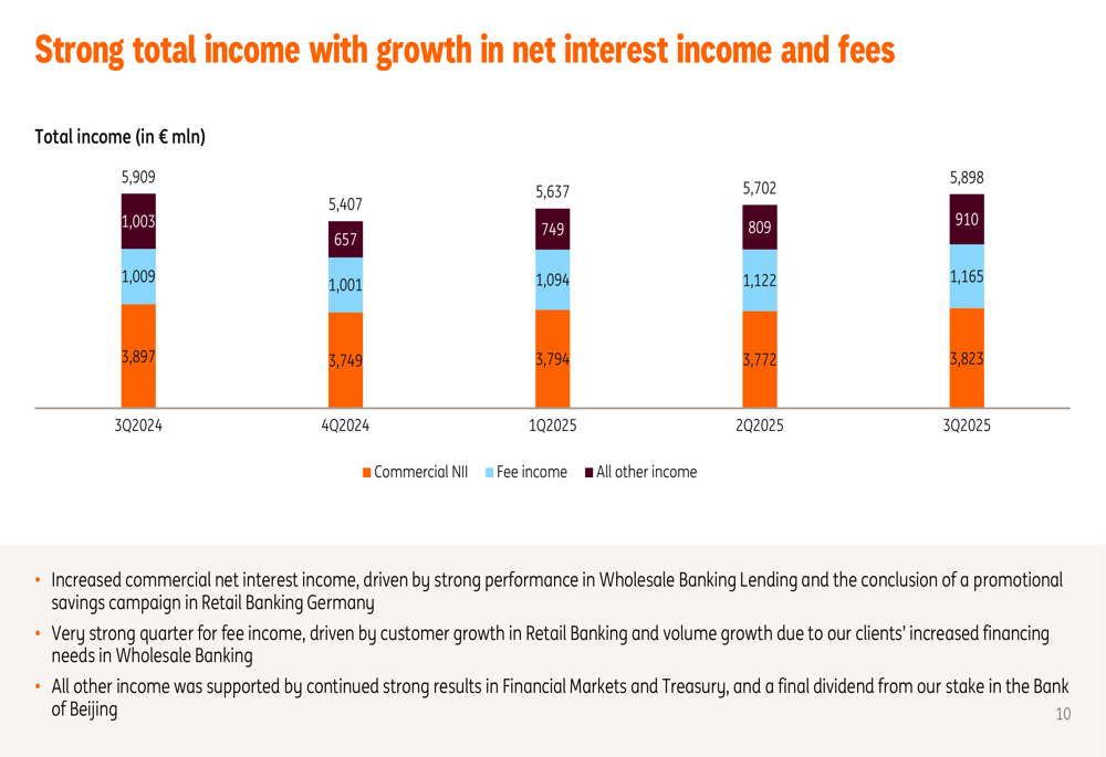 Total income for Q3 2025 reached €5,898 million, with commercial net interest income contributing €3,823 million and fee income adding €910 million. The remainder came from other income sources, including strong results from Financial Markets and Treasury operations, plus a final dividend from ING’s stake in the Bank of Beijing.