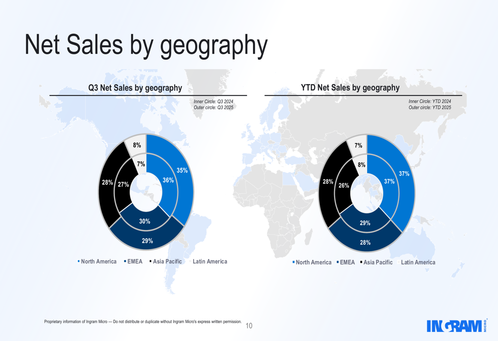 Ingram Micro's global footprint continues to evolve, with notable shifts in revenue contribution by region. Latin America and North America showed increased contribution to overall sales, while Asia Pacific's share slightly decreased in Q3 2025 compared to the prior year.