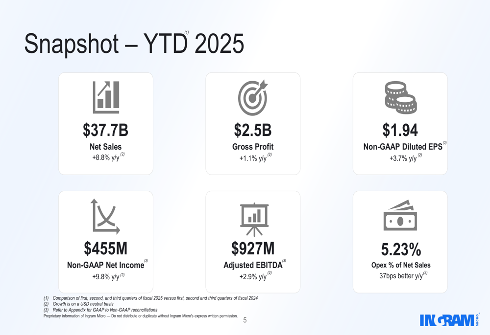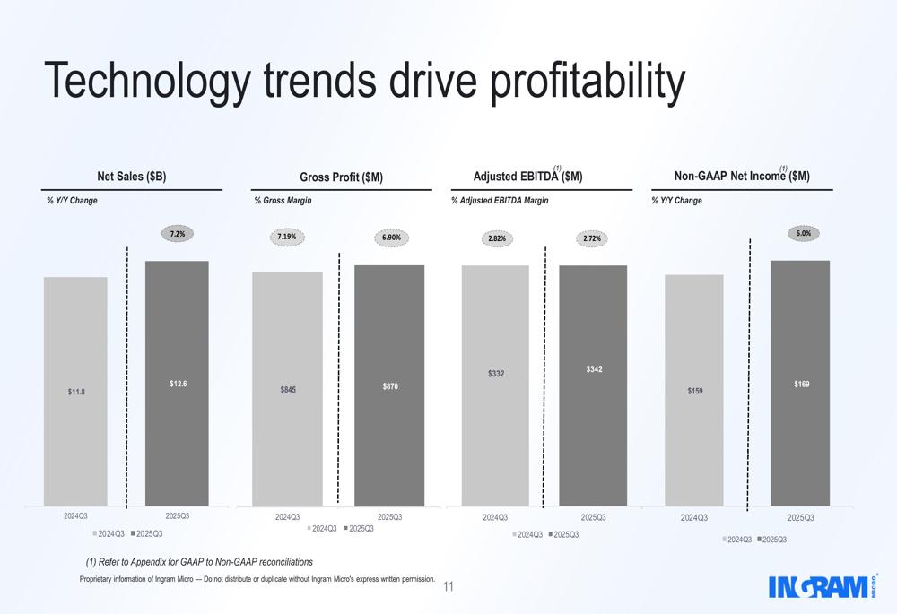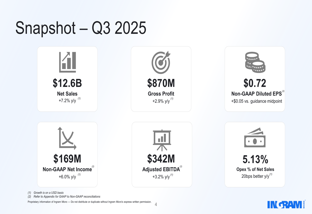 Ingram Micro reported solid top-line growth for Q3 2025, with net sales reaching $12.6 billion, a 7.2% increase year-over-year. The company achieved non-GAAP net income of $169 million, up 6.0% from the prior year, while adjusted EBITDA rose 3.2% to $342 million.