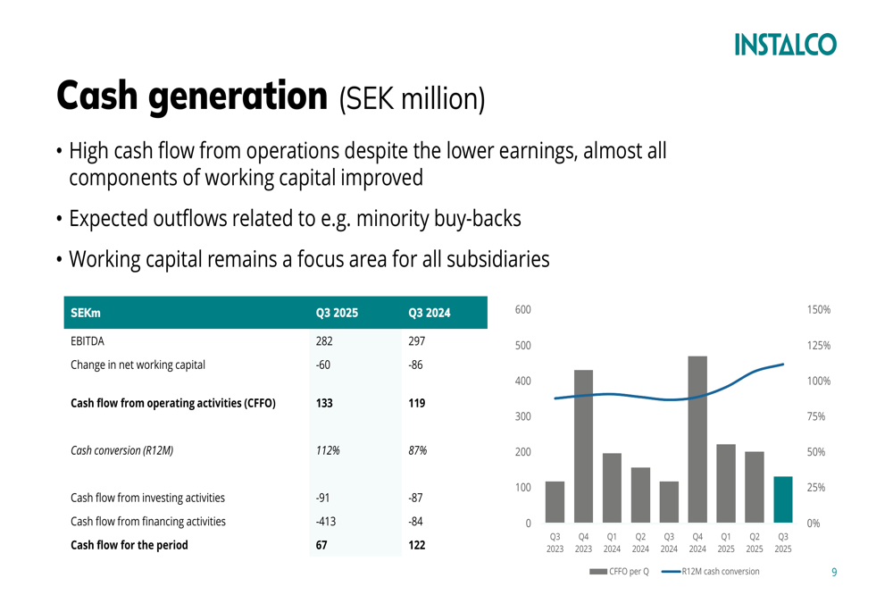 Despite lower earnings, Instalco reported strong cash flow from operations of SEK 133 million, up from SEK 119 million in Q3 2024, with improvements in nearly all working capital components. The company’s cash conversion rate on a trailing twelve-month basis reached 112%, compared to 87% in the prior year.