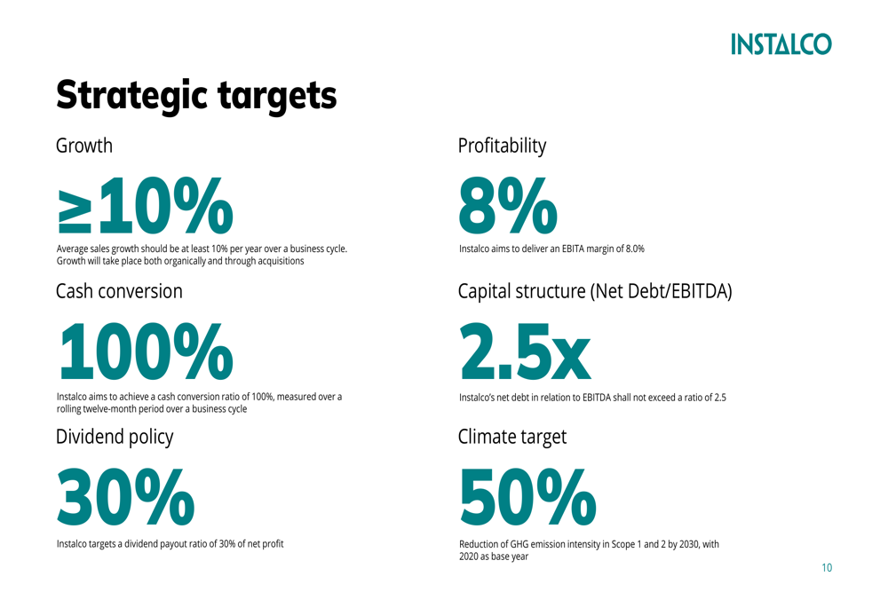 Instalco maintains ambitious strategic targets despite current challenges, including growth of at least 10% per year over a business cycle, an EBITA margin of 8% (compared to the current 6.4% on a last twelve months basis), and a cash conversion target of 100%.