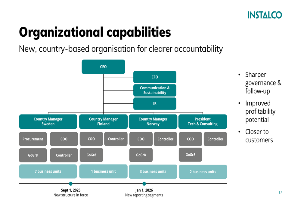 CEO Per Sjöstrand introduced "Instalco 2.0," a strategic initiative featuring a new country-based organizational structure implemented on September 1, 2025. The reorganization aims to create clearer accountability and improve profitability.