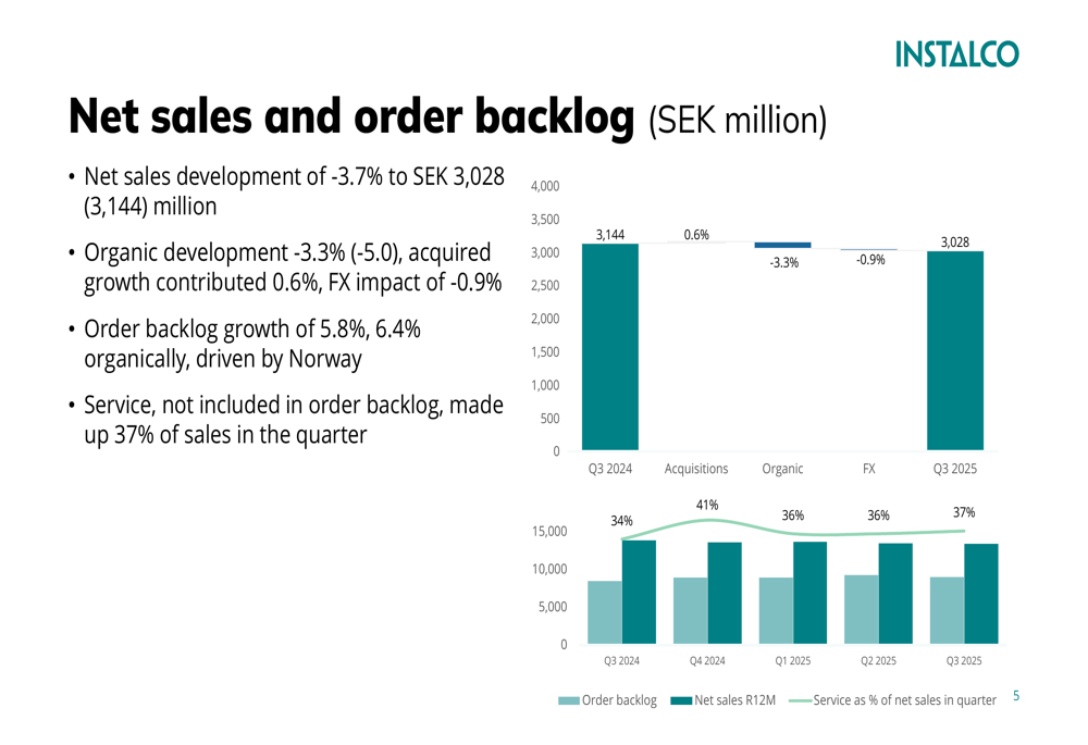 The company’s order backlog grew by 5.8% to SEK 9,026 million, with organic growth of 6.4% primarily driven by Norway. Service components, which are not included in the order backlog, represented 37% of sales in the quarter.