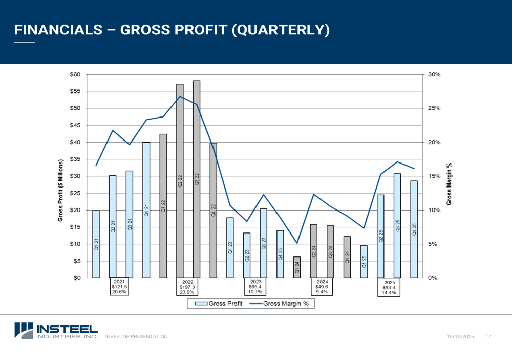 The quarterly breakdown of gross profit reveals a consistent upward trend throughout 2025, with Q3 and Q4 showing particularly strong results. This improvement occurred despite raw materials constituting 68% of the company’s cost of sales, highlighting Insteel’s ability to manage input costs effectively: