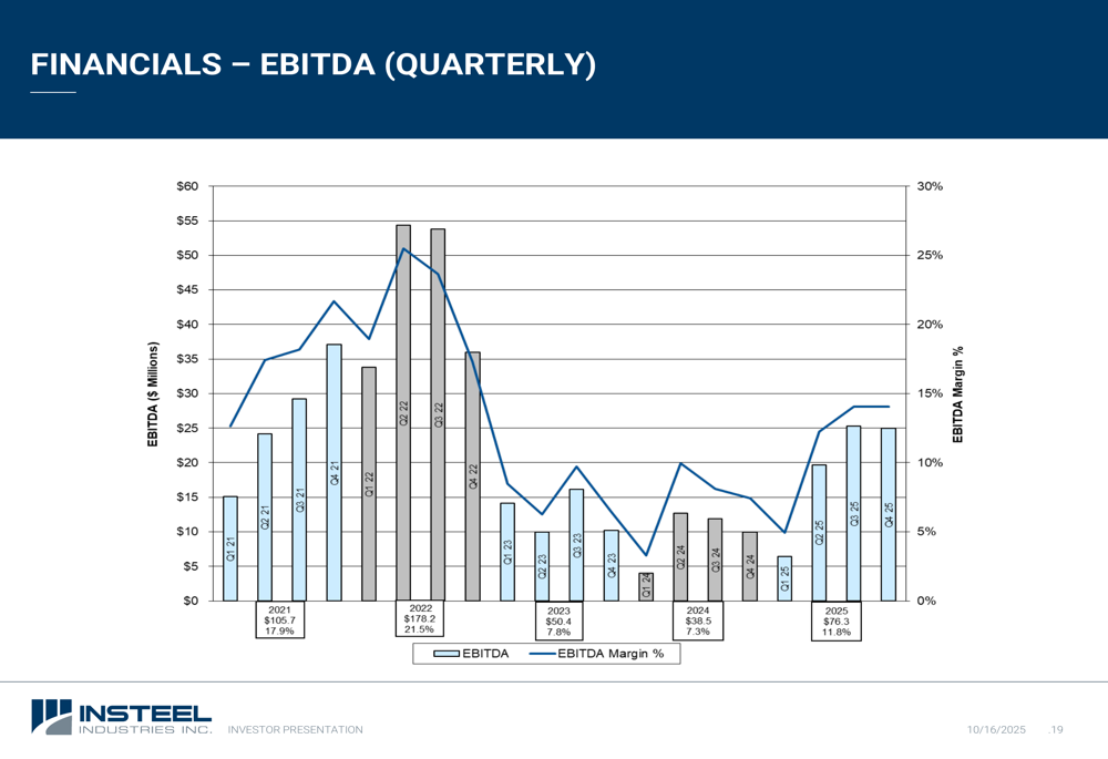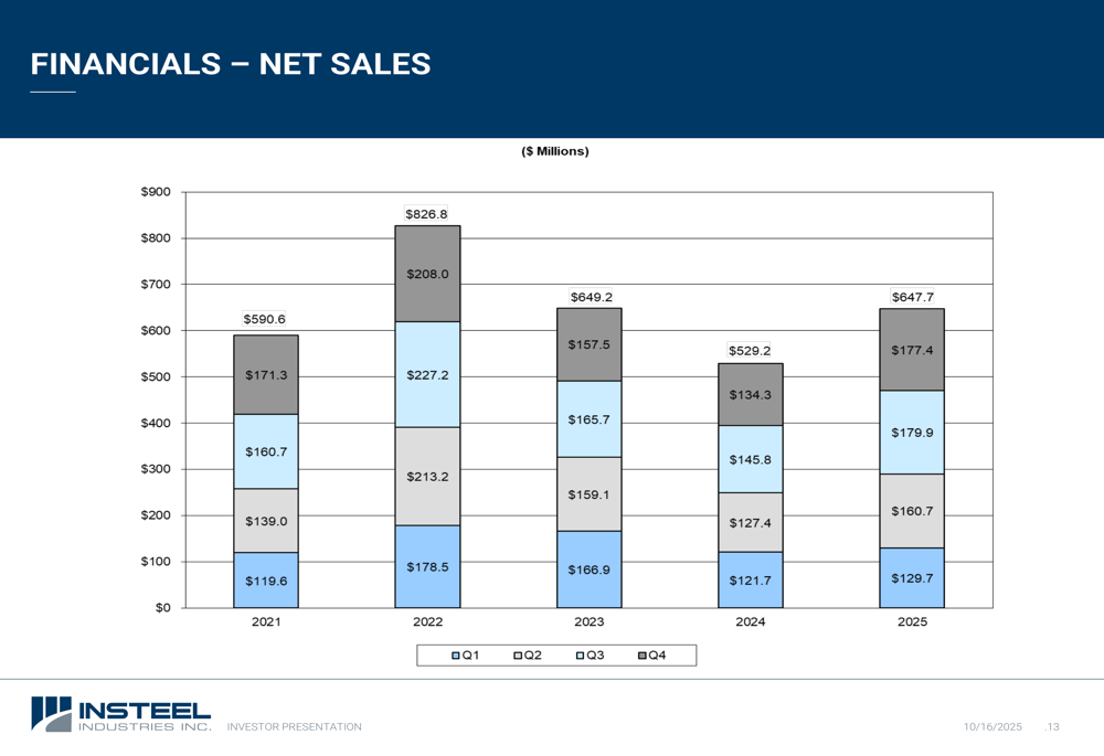 For the full fiscal year 2025, Insteel generated total net sales of $647.7 million, representing a 22.4% increase from $529.2 million in 2024. The company’s quarterly sales pattern shows a steady recovery throughout 2025, with Q3 and Q4 being particularly strong: