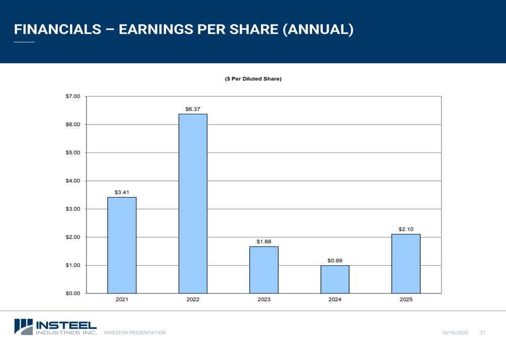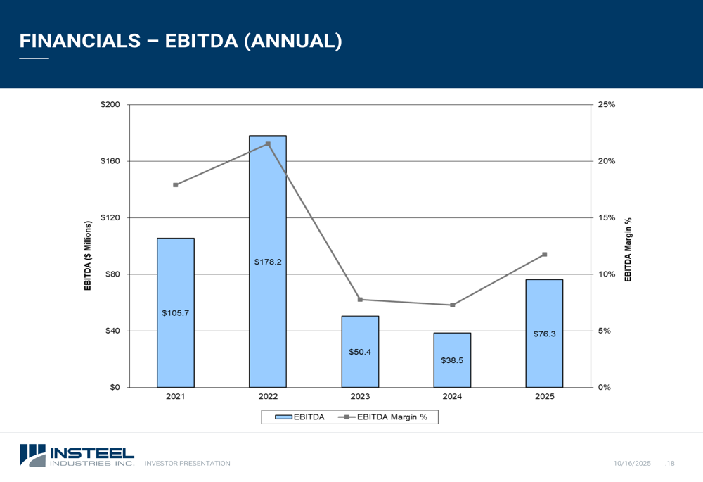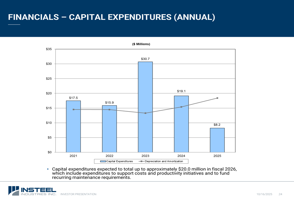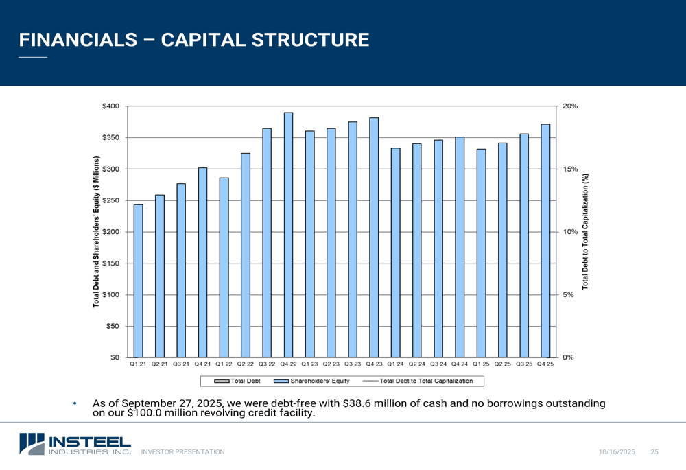 The company maintains a strong balance sheet with no debt and $38.6 million in cash as of September 27, 2025. This financial flexibility positions Insteel well for future growth opportunities: