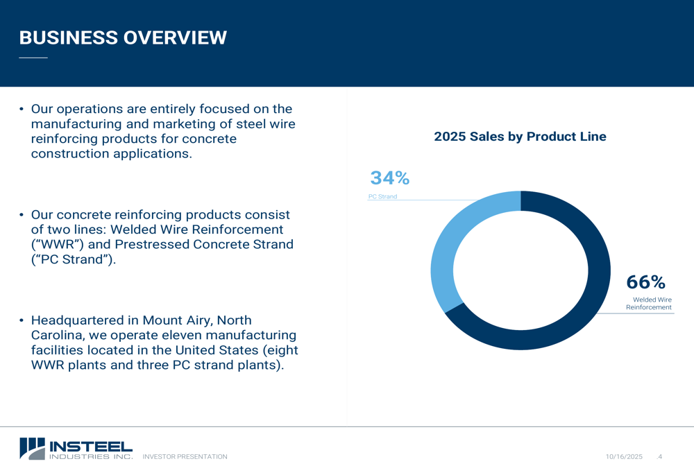Founded in 1953 and headquartered in Mount Airy, North Carolina, Insteel operates 11 manufacturing facilities across the United States, employing 1,007 people. The company’s business is focused on two main product lines: Welded Wire Reinforcement (WWR) and Prestressed Concrete Strand (PC Strand).