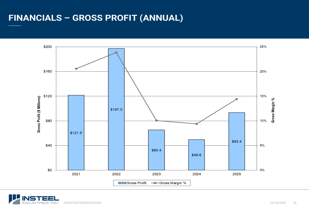 Insteel’s gross profit performance showed marked improvement in 2025, reaching $93.4 million (14.4% margin) compared to $49.6 million (9.4% margin) in 2024. This represents a 500 basis point improvement in gross margin, though still below the peak levels seen in 2021-2022: