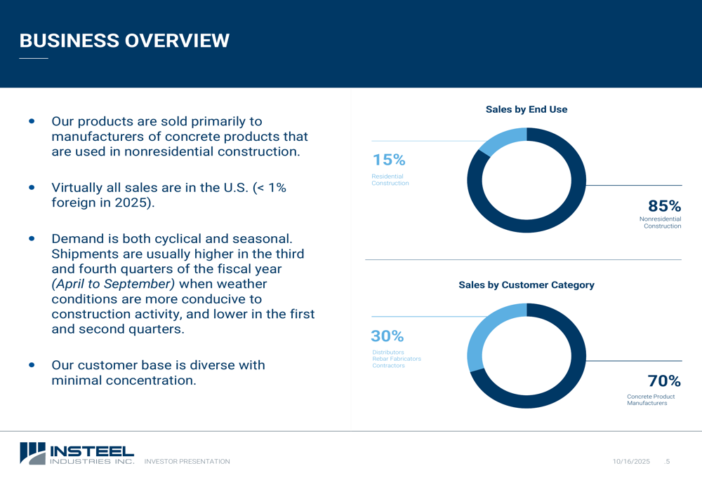 Insteel’s customer and market diversification remains stable, with 85% of sales directed to nonresidential construction and 15% to residential construction. From a customer perspective, 70% of sales go to concrete product manufacturers, while the remaining 30% are distributed among distributors, rebar fabricators, and contractors: