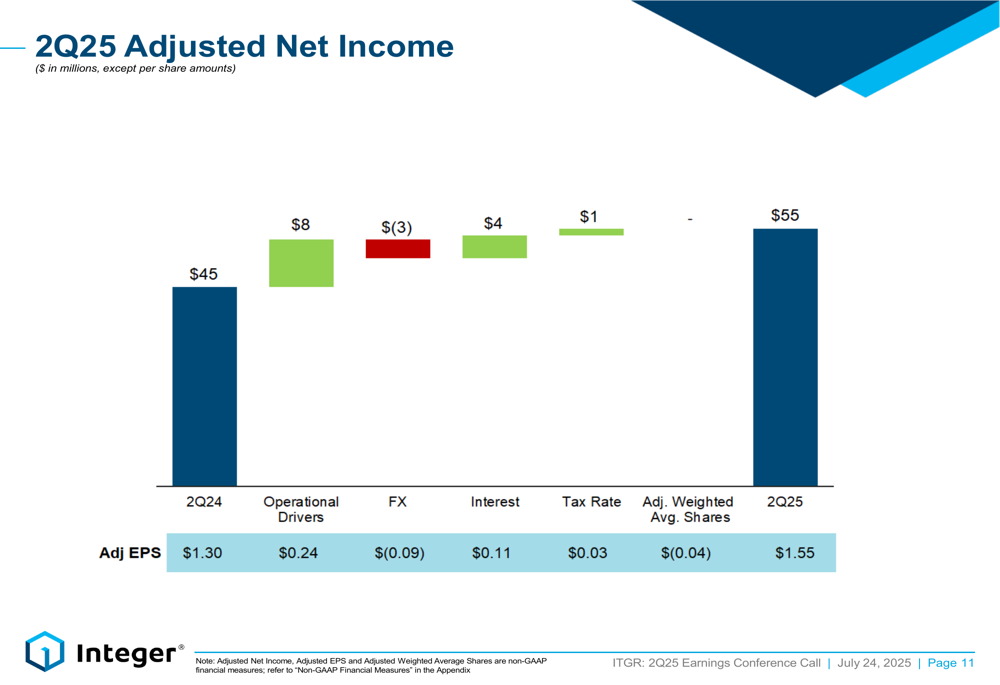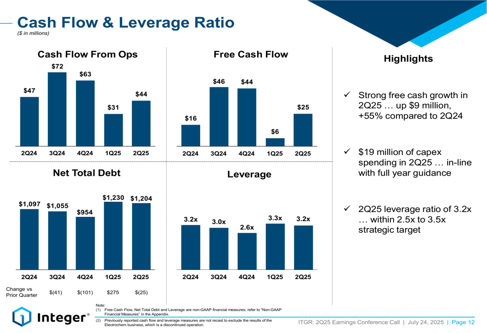 Integer demonstrated improved cash generation in the quarter, with free cash flow of $25 million representing a 55% increase compared to Q2 2024. The company maintained a healthy balance sheet with its leverage ratio at 3.2x, well within its strategic target range of 2.5x to 3.5x.