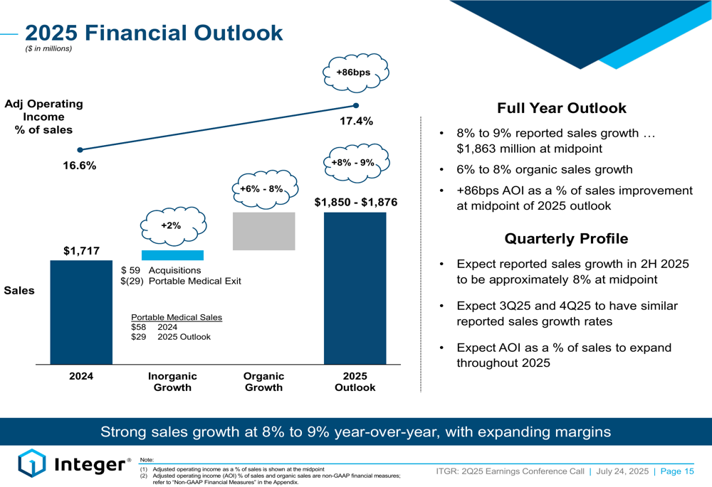 Integer raised its adjusted operating income outlook by $2 million at the midpoint while maintaining its sales guidance. The company now projects full-year 2025 sales between $1,850 million and $1,876 million, representing 8-9% growth over 2024.