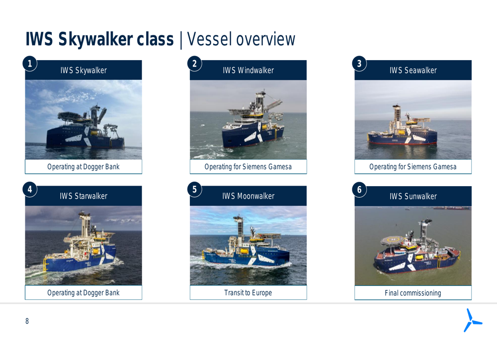 The company’s fleet of six Skywalker-class vessels is in various stages of operation and delivery, with four currently operating, one in transit to Europe, and one in final commissioning. This visual overview shows the current status of each vessel: