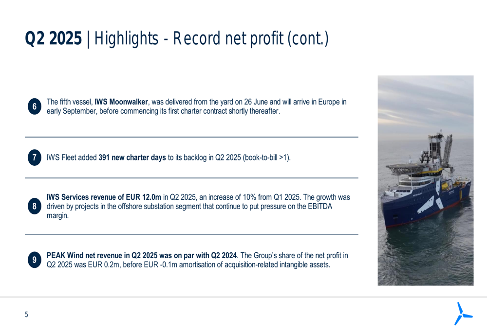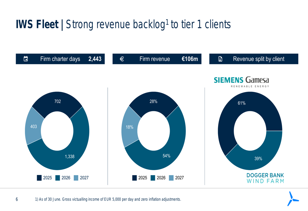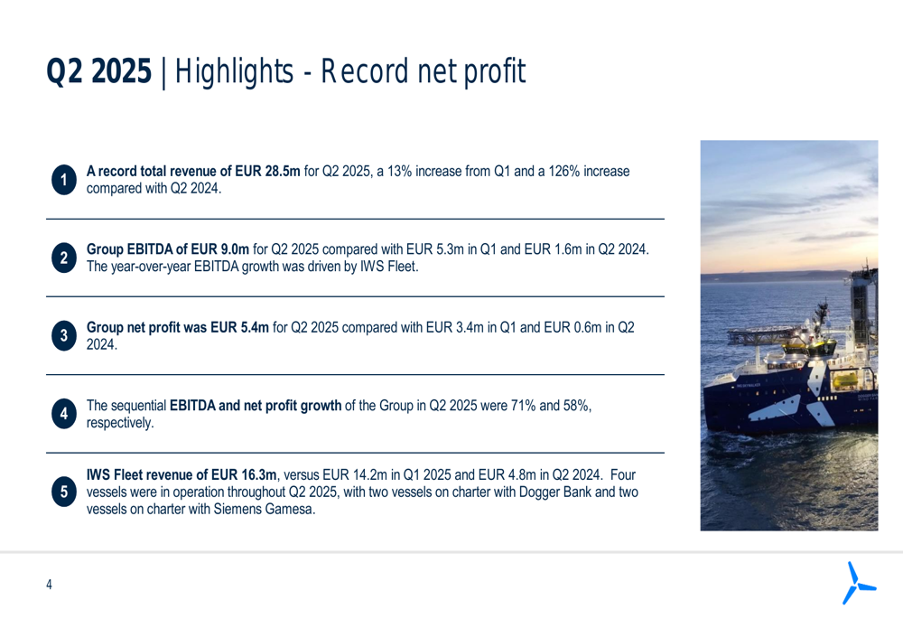 IWS Fleet, the primary growth driver for the company, generated revenue of EUR 16.3 million in Q2 2025, compared to EUR 14.2 million in Q1 and EUR 4.8 million in Q2 2024. Four vessels were operational throughout Q2, with two vessels on charter with Dogger Bank and two with Siemens Gamesa.