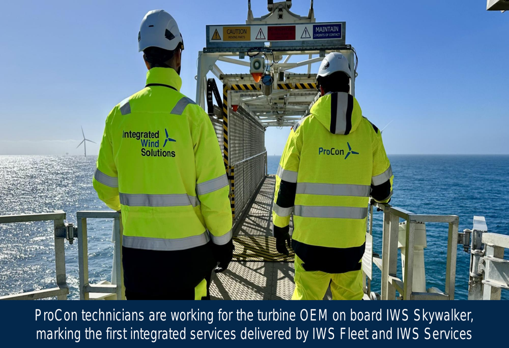 The company highlighted its integrated service model, where IWS Fleet and IWS Services work together to provide comprehensive solutions to clients. The following image shows ProCon technicians working for a turbine OEM on board the IWS Skywalker, representing the first integrated services delivered jointly by both divisions: