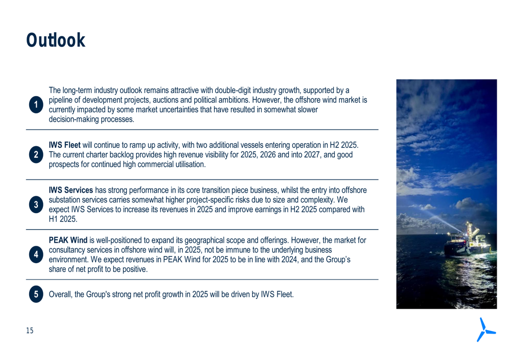 Management anticipates strong net profit growth in 2025, primarily driven by IWS Fleet. IWS Services is expected to maintain strong performance in its core transition piece business, while PEAK Wind is positioned to expand its geographical scope and offerings.