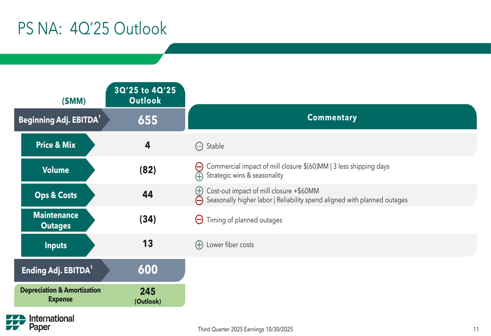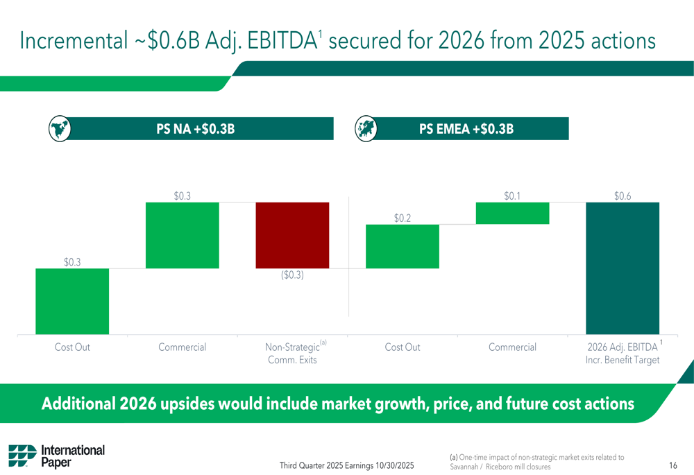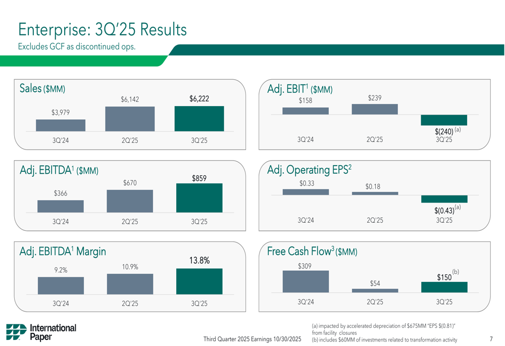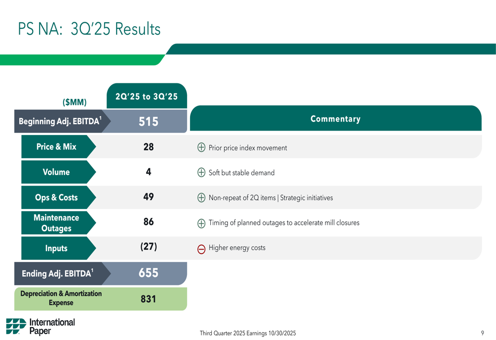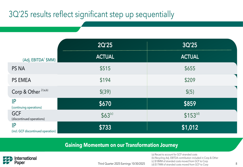 International Paper’s Q3 2025 results present a complex picture of a company making progress on its strategic transformation while facing significant market headwinds and struggling to meet investor expectations. The substantial improvement in EBITDA demonstrates operational progress, but the disappointing EPS figure raises questions about the company’s ability to translate operational improvements into bottom-line results.