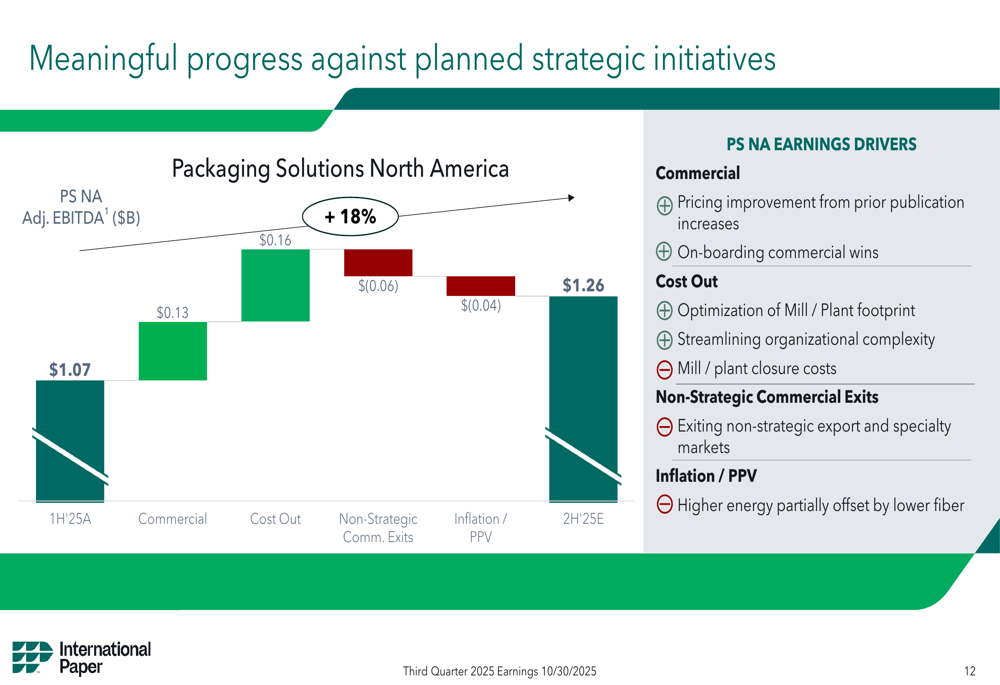 International Paper reported meaningful progress against its planned strategic initiatives, particularly in commercial improvements and cost reduction: