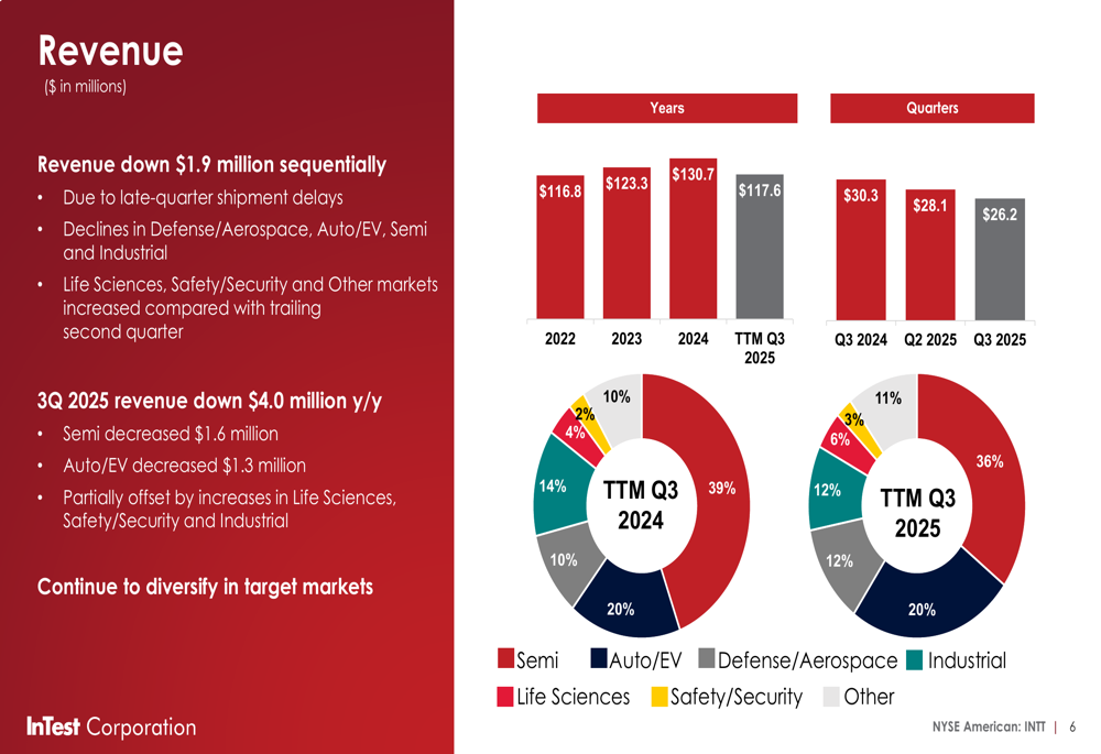 inTest continues to execute its Vision 2030 Growth Strategy, focusing on diversification across multiple markets. The company’s revenue mix for the trailing twelve months ended Q3 2025 shows semiconductor at 36%, industrial at 20%, auto/EV and defense/aerospace each at 12%, life sciences at 10%, safety/security at 6%, and other markets at 3%.