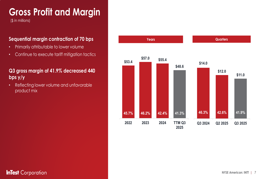 inTest’s gross profit for Q3 2025 was $11.0 million, representing a gross margin of 41.9%, down from 42.6% in Q2 2025 and 46.3% in Q3 2024. The margin contraction was primarily attributed to lower volume and an unfavorable product mix.