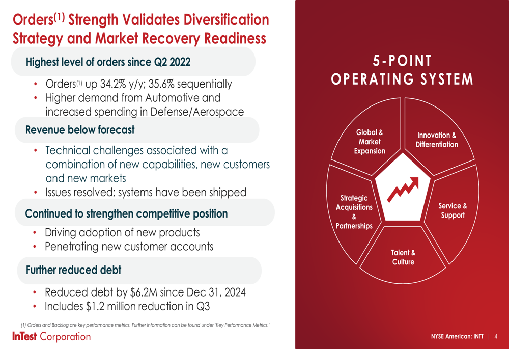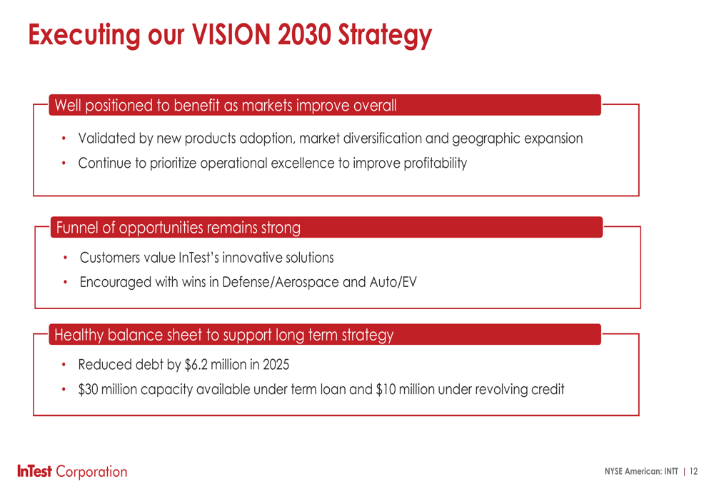 inTest remains focused on executing its long-term strategy, supported by a healthy balance sheet with reduced debt and approximately $61 million in liquidity, including $21.1 million in cash and a $40 million borrowing capacity.