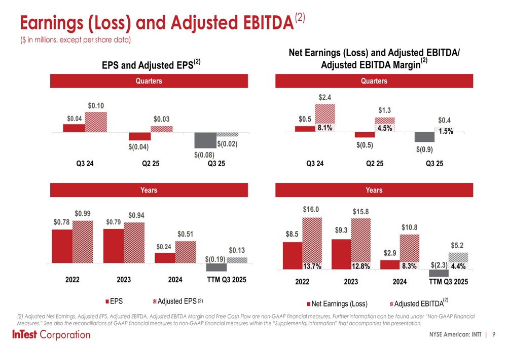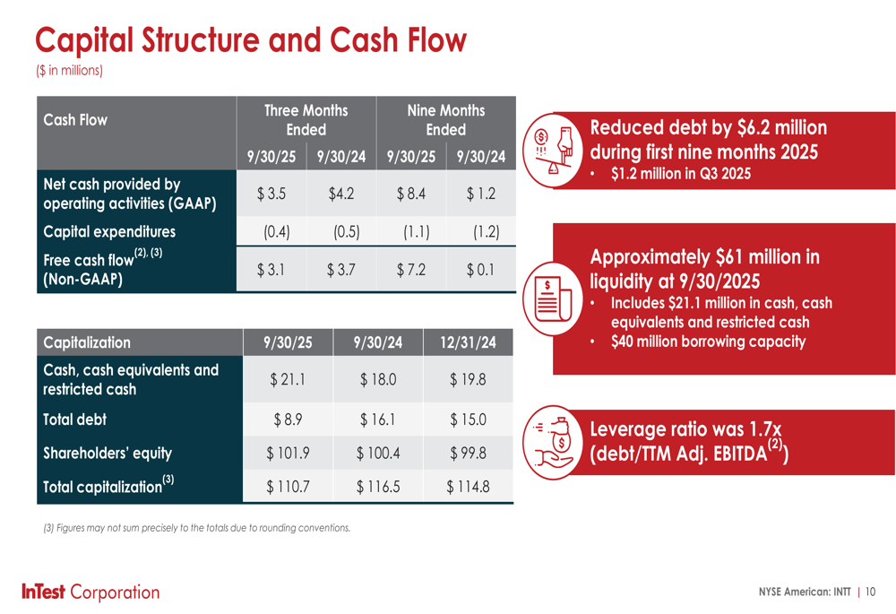 On a positive note, inTest continued to strengthen its balance sheet by reducing debt by $6.2 million since December 31, 2024, including $1.2 million in Q3 2025. The company ended the quarter with $21.1 million in cash and cash equivalents, up from $19.8 million at the end of 2024, and total debt of $8.9 million, down from $15.0 million at year-end 2024.