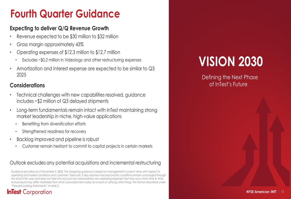 Looking ahead, inTest provided Q4 2025 revenue guidance of $30-32 million, which includes approximately $2 million of delayed Q3 shipments. The company expects a gross margin of approximately 43% and operating expenses between $12.3 million and $12.7 million, excluding about $0.2 million in restructuring expenses.