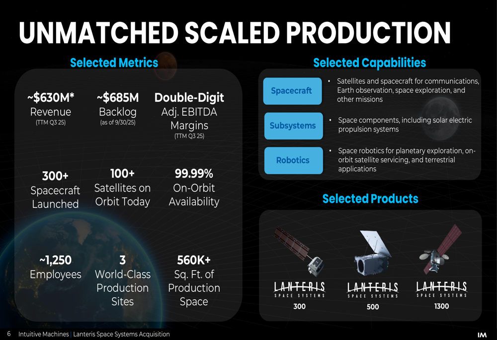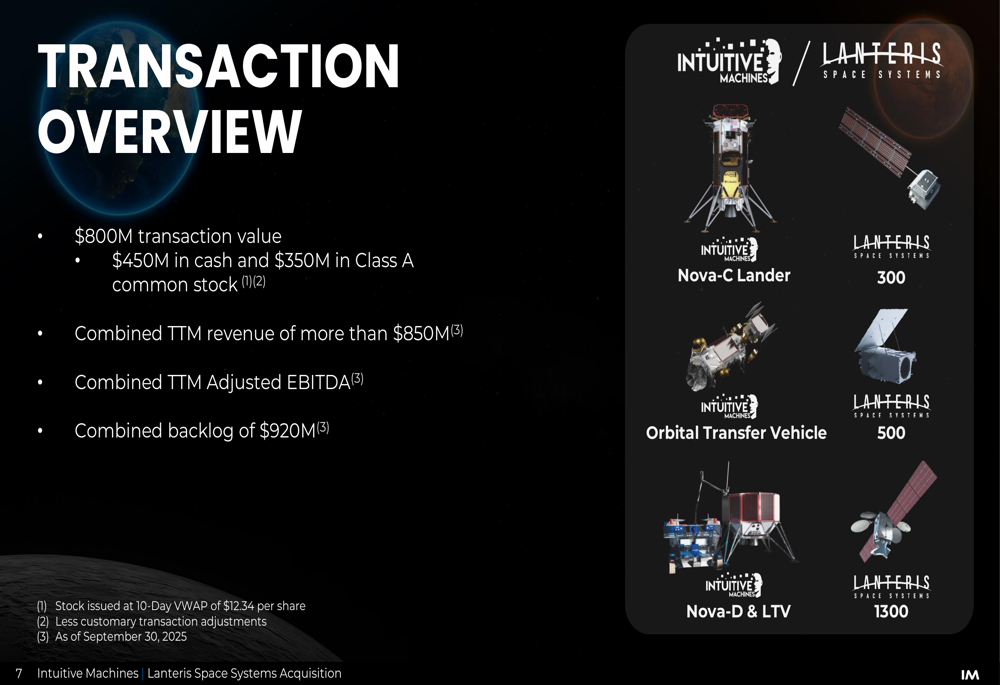 The acquisition, valued at $800 million, will be funded through a combination of $450 million in cash and $350 million in Class A common stock. According to the presentation, the combined entity will have trailing twelve-month revenue exceeding $850 million and a backlog of $920 million, significantly larger than Intuitive Machines' reported Q3 backlog of $235.9 million.